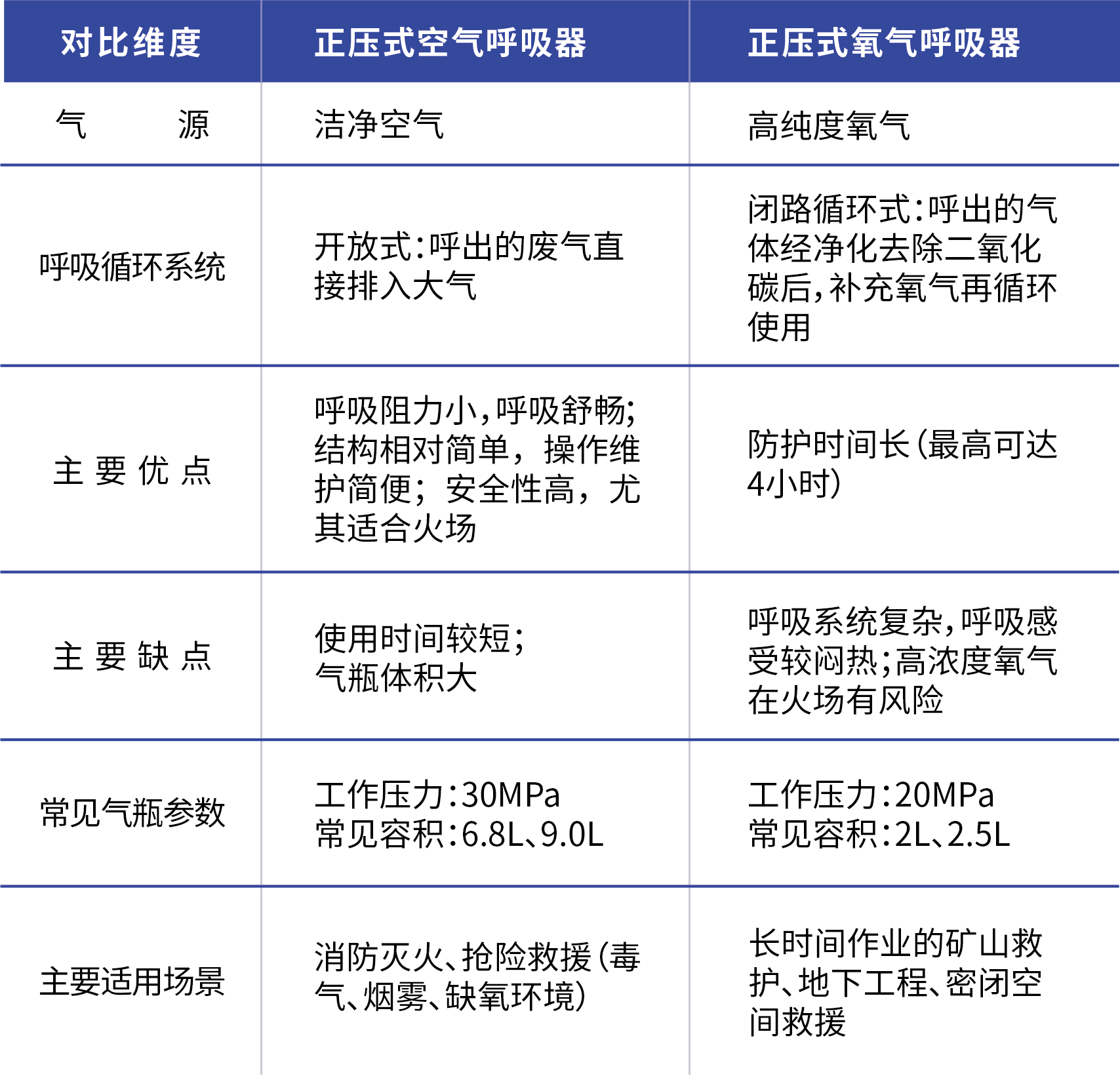 正压式空气呼吸器理论使用时间通常续航1小时左右,正压式氧气呼吸器续航时间最高可达4小时,更适合长时间作业。